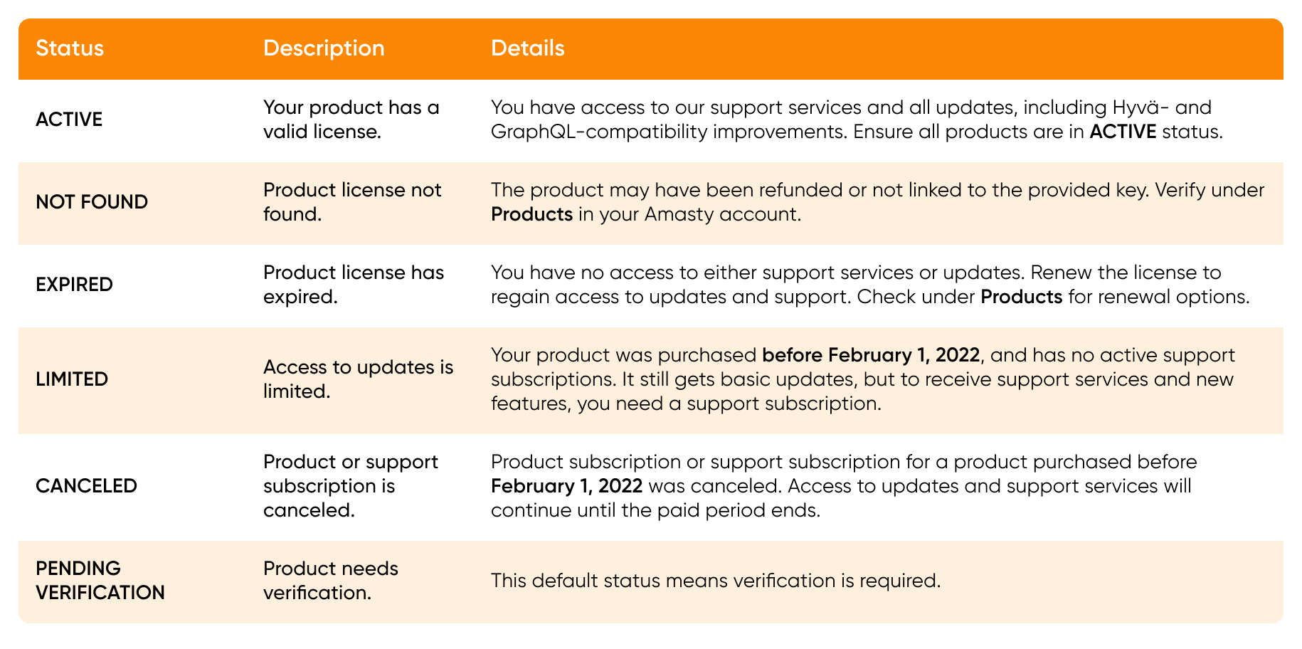- Canceled – At the moment, no further actions are required to use the product. To make sure you have access to product updates and support after the paid period ends, please prolong the product subscription, or visit this page to obtain a support subscription for products purchased before February 1, 2022.