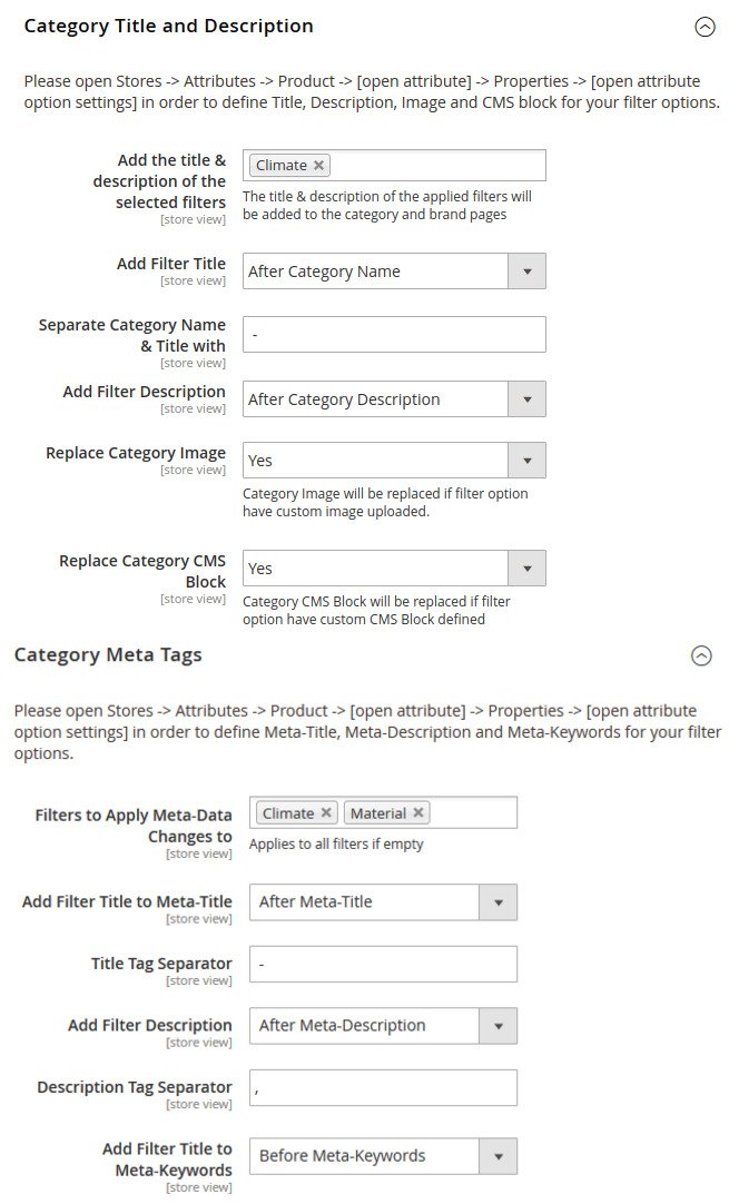 To find the options, go to the Stores > Configuration> Improved Layered Navigation menu and define whether the title, description, and the metadata of the selected filters should be added differently and, if so, specify what attributes should change the title and description: