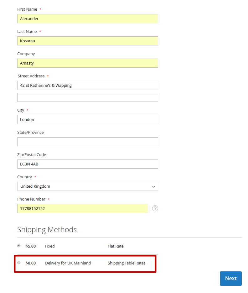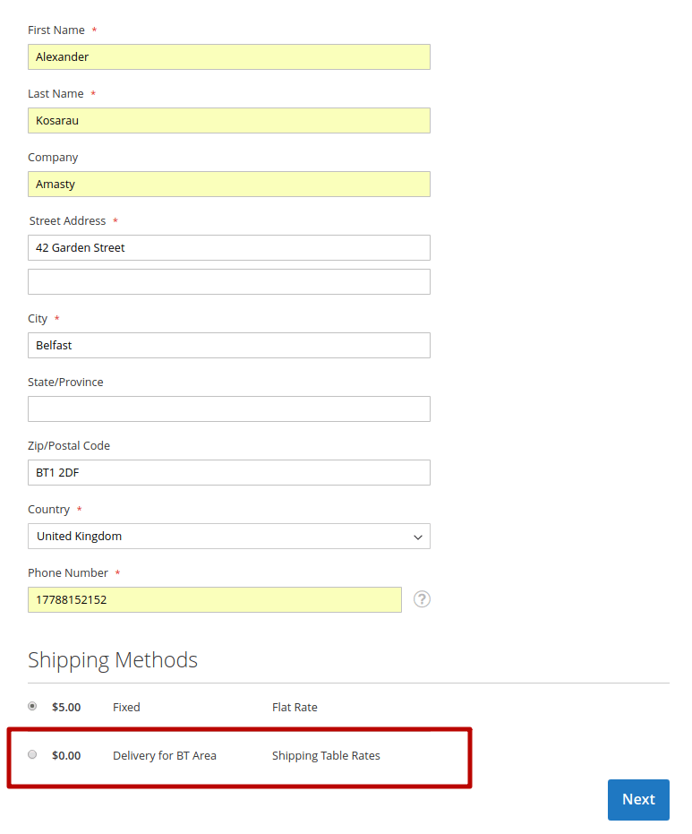 Suppose a customer’s postal code is BT1 2DF. It matches both rates with the BT% and ALL configurations. As the BT% group is a subset of All and it fits the customer’s address better, only the rate related to BT% will apply. Customers coming from outside Belfast will see rates as for UK mainland. This is how it looks like in Magento: