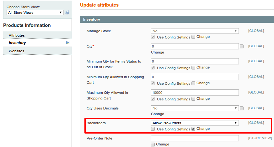 In order to set products from a particular category to Pre order, you need to apply a mass action called “Update Attributes”. On the inventory tab you will need to choose “Allow Pre-Orders” in the backorders field: