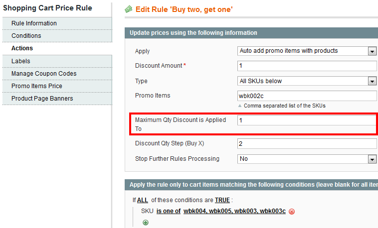 Special Offers Yes. If you want to have only one free item added in one order, specify '1' in the ‘Maximum Qty Discount is Applied To’ field during rule creation.