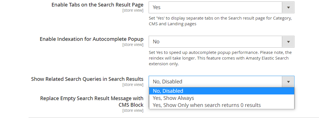 Step 12. The last general setting is Replace Empty Search Result Message with CMS Block. Choose the needed option in the dropdown. Set No if you want the zero search results page to remain empty or choose one of the shown blocks.