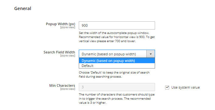 Step 4. Specify the autocomplete's Popup width (px), choose the Search Field Width in the dropdown, and set the Min Characters parameter to define the number of characters to start the search process (3 by default).