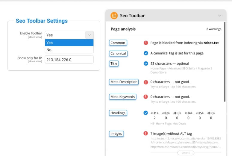 Besides, it has a live analytics tool that allows you to control how well Categories, Products, and CMS pages are organized. You can customize analysis templates with your attributes. Finally, this plugin allows you to manage redirects from deleted pages and avoid 404 errors.