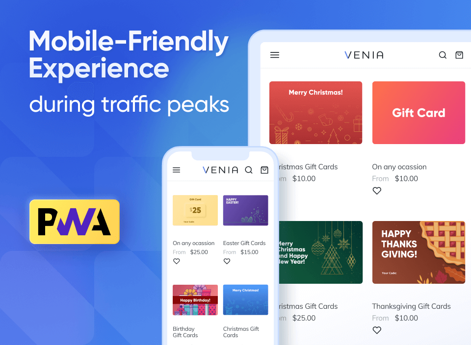 The PWA add-on for Gift Cards showcases full compatibility with the Venia PWA storefront. Being installed on Magento 2, this theme doesn’t require any manipulation with the existing database, and doesn’t conflict with your website environment. We have run lots of tests to ensure simple integration and stable work of our add-on with the Venia storefront.